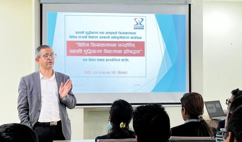 काठमाडौं, १५ माघ । सन नेपाल लाइफ इन्स्योरेन्स कम्पनी लिमिटेडले कर्पोरेट कार्यालय लगायत देशैभरीका कार्यालयहरुमा “सम्पत्ति शुद्धीकरण निवारण राष्ट्रिय दिवस” को अवसरमा देशभरका कार्यालयमा सम्पत्ति शुद्धिकरण तथा आतङ्कवादी क्रियाकलापमा वित्तिय लगानी निवारणसम्वन्धी अभिमुखीकरण कार्यक्रम सम्पन्न गरेको छ ।