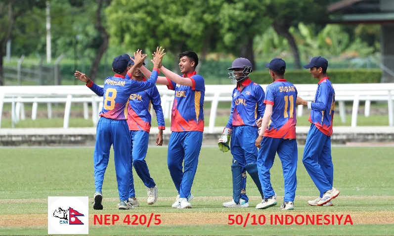 ४ सय २१ रनको विशाल लक्ष्य पछ्याएको इण्डोनेसिया २४.३ ओभरमा ५० रनमा अलआउट भयो ।