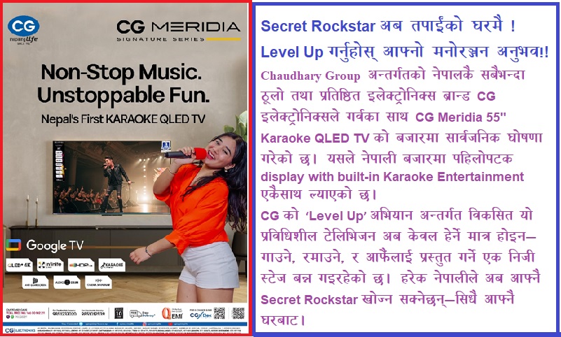 CG को ‘Level Up’ अभियान अन्तर्गत विकसित यो प्रविधिशील टेलिभिजन अब केवल हेर्ने मात्र होइन— गाउने, रमाउने, र आफैंलाई प्रस्तुत गर्ने एक निजी स्टेज बन्न गइरहेको छ। हरेक नेपालीले अब आफ्नै Secret Rockstar खोज्न सक्नेछन्—सिधै आफ्नै घरबाट।