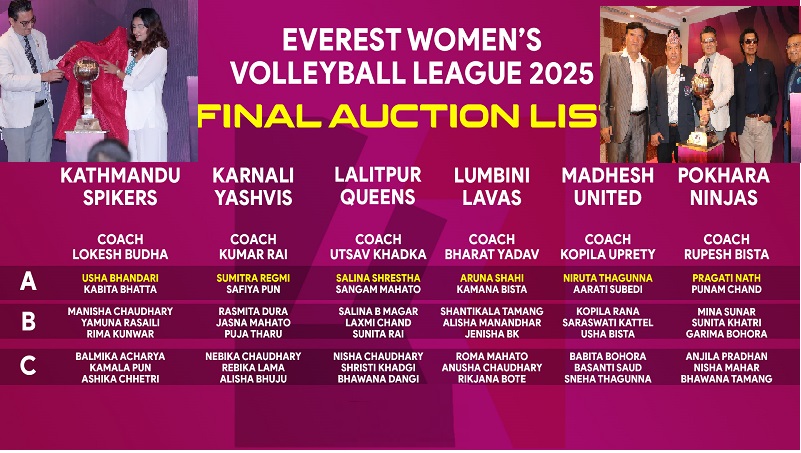 काठमाडौं, २ साउन । एभरेष्ट महिला भलिबल लिग (इडब्लुभीएल) २०२५ को ऐतिहासिक अक्सन काठमाडौंमा सम्पन्न भएको छ। आजै नेपाल भलिबल एशोसियसनले दोस्रो संस्करणको कप पनि सार्वजनिक गरेको छ ।