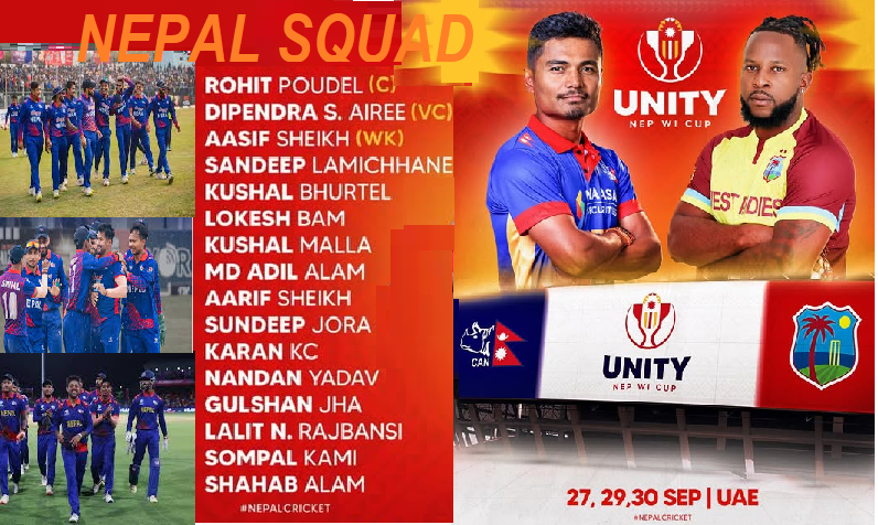 काठमाडौँ, ३० भदौः नेपाल क्रिकेट सङ्घ (क्यान) ले वेस्ट इन्डिजविरुद्ध हुने युनिटी कप ट्वान्टी–२० अन्तरराष्ट्रिय शृङ्खलाका लागि नेपालको टोली घोषणा गरेको छ ।