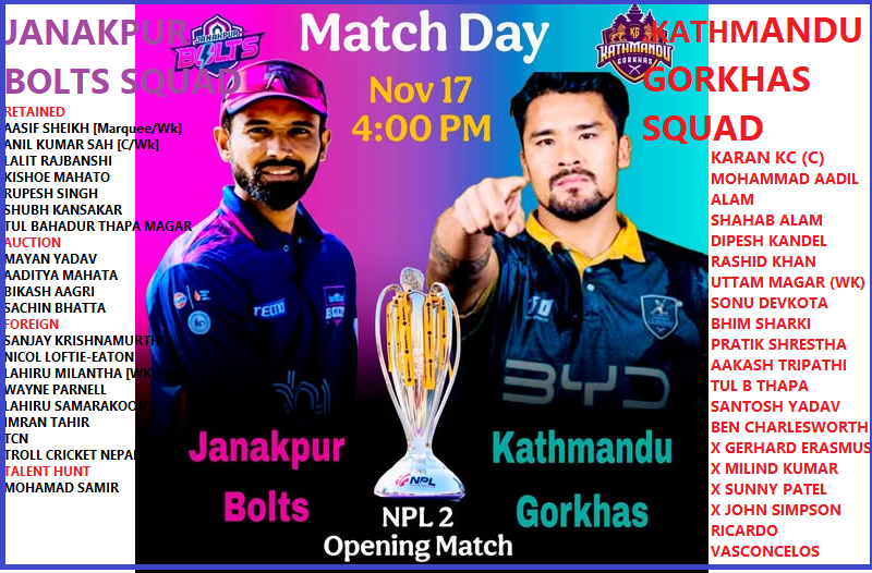 काठमाडौँ, १ मङ्सिर : आजदेखि सुरु हुने नेपाल प्रिमियर लिग (एनपिएल)को उद्घाटन खेलमा साविक विजेता जनकपुर बोल्ट्स र काठमाडौंँ गोर्खाज भिड्दैछन् । र्कीतिपुरस्थित अन्तरराष्ट्रिय त्रिवि क्रिकेट मैदानमा हुने उक्त खेल साँझ ४ बजे सुरु हुनेछ । पहिलो संस्करणको खेलमा जनकपुरले काठमाडौँलाई सहजै हराएको थियो । यस पट्क पनि जनकपुरले काठमाडौँलाई हराउने उद्देश्यका साथ मैदानमा उत्रनेछ । त्यसो त काठमाडौँ पनि अघिल्लो संस्करणको हारको बदला लिँदै जित हासिल गर्न चाहन्छ ।