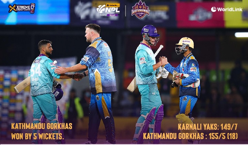 काठमाडौँ, १४ मङ्सिरः नेपाल प्रिमियर लिग (एनपिएल) अन्तर्गत आज भएको खेलमा काठमाडौँ गोर्खाजले कर्णाली याक्सलाई पाँच विकेटले पराजित गरेको छ ।
