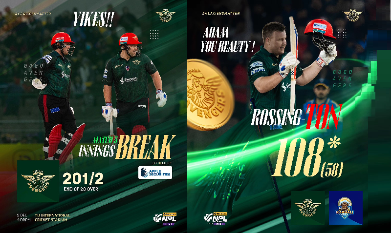 काठमाडौँ, १६ मङ्सिरः नेपाल प्रिमियर लिग (एनपिएल)अन्तरगत आजको दोस्रो खेलमा एडम रोसिङटनको शतकमा पोखरा एभेन्जर्सले कर्णाली याक्सलाई २०२ रनको लक्ष्य दिएको छ ।