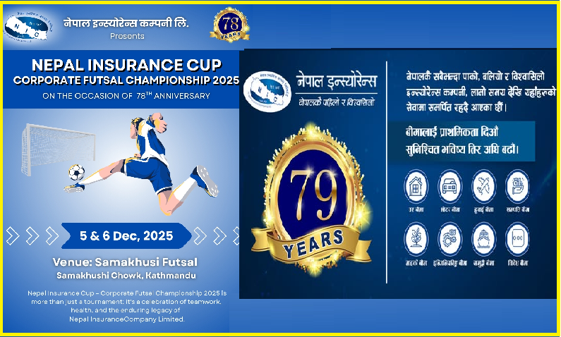 काठमाडौं, १७ मंसिर । नेपाल ईन्स्योरेन्स कम्पनी लिमिटेडद्धारा यही मिति २०८२ साल मसिंर १९ र २० गते सामाखुसी फुटसल मैदानमा फुटसल प्रतियोगिता आयोजना गर्ने भएको छ ।