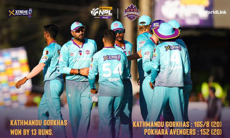 काठमाडौँ, १८ मङ्सिरः राजधानीमा जारी दोस्रो संस्करणको नेपाल प्रिमियर लिग (एनपिएल) मा काठमाडौँ गोर्खाज प्लेअफमा पुग्ने दोस्रो टोली बनेको छ । यसअघि सुदूरपश्चिम रोयल्स प्लेअफमा पुगिसकेको छ । आजको खेलमा काठमाडौँले पोखरा एभेन्जर्सलाई १३ रनले हराउँदै प्लेअफमा स्थान सुरक्षित गरेको हो ।