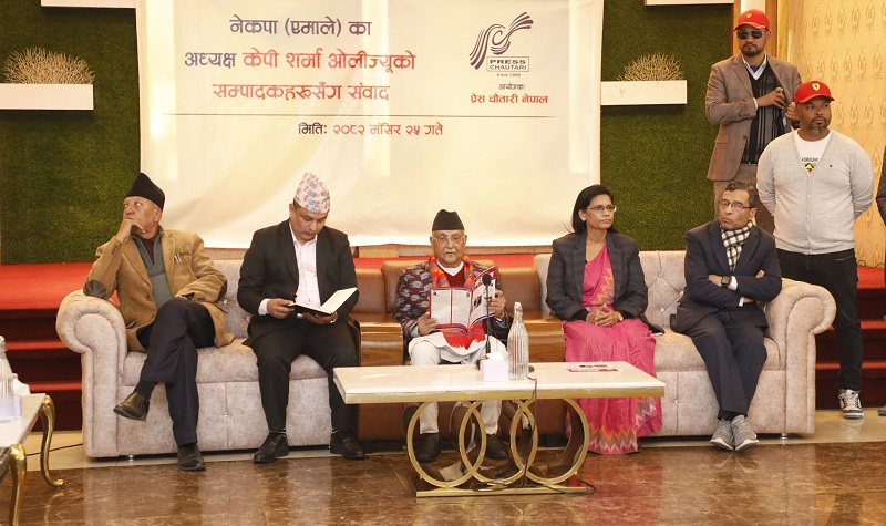 अध्यक्ष ओलीले संसद् पुनःस्थापनालगायत राष्ट्रिय राजनीतिका विषयमा नेपाली कांग्रेसका सभापति शेरबहादुर देउवासँगको भेटमा संवाद भएको जनाउँदै एमाले संसद् पुनःस्थापनाको पक्षमा रहेको बताउनुभयो । अदालतको फैसलालाई चित्त नबुझे पनि मान्दै आएको सन्दर्भ उल्लेख गर्दै अध्यक्ष ओलीले गत भदौ २३ र २४ गतेको आन्दोलनबारे छानबिन गर्न गठित जाँचबुझ आयोगमा आफूले बयान दिन जानुपर्ने कानुनी व्यवस्था नभएको जिकिर गर्नुभयो । एमालेको महाधिवेशन यही मङ्सिर २७ देअि २९ गतेसम्म काठमाडौँमा हुँदैछ ।