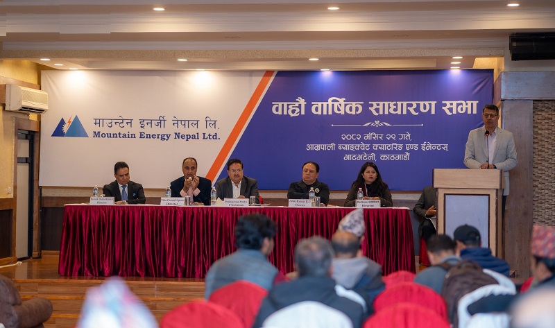 काठमाडाँै, २९ मङ्सिरः माउन्टेन इनर्जी नेपाल लिमिटेडको बाह्रौं वार्षिक साधारण सभा सोमबार काठमाडौंमा सम्पन्न भएको छ । कम्पनीका अध्यक्ष प्रदीपजंग पाण्डेको अध्यक्षतामा सम्पन्न सभाले लाभांश वितरणलगायतका विभिन्न प्रस्तावहरू पारित गरेको छ ।