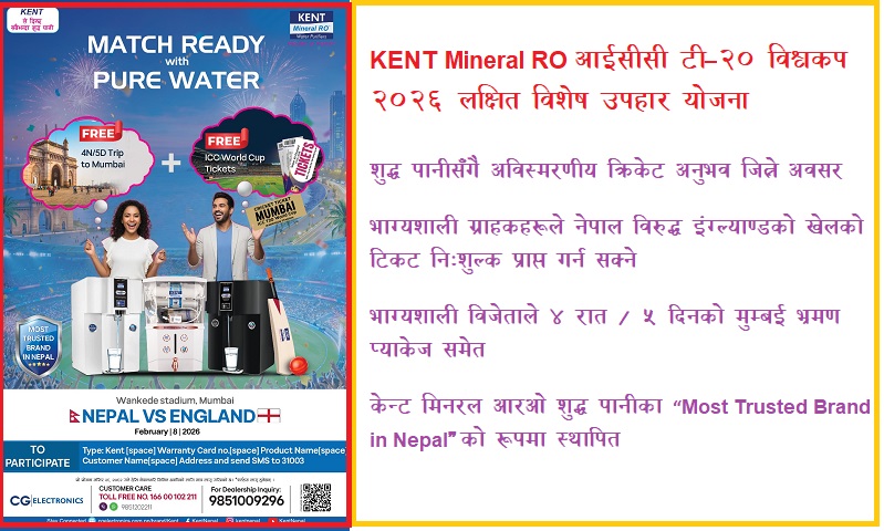 काठमाडौं, १ पौष । विश्वकै अग्रणी पानी शुद्धीकरण ब्रान्ड केन्ट मिनरल आरओ (KENT Mineral RO) ले आईसीसी टी–२० विश्वकप २०२६ लाई लक्षित गर्दै नेपाली उपभोक्ताका लागि विशेष उपहार योजना सार्वजनिक गरेको छ। “Match Ready with Pure Water” नारासहित ल्याइएको यस योजनामार्फत केन्टका ग्राहकहरूले शुद्ध पानीसँगै अविस्मरणीय क्रिकेट अनुभव जित्ने अवसर पाउनेछन्।