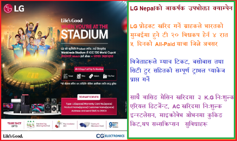 काठमाडौं, ३ पौष । LG Nepal ले विश्वस्तरीय अत्याधुनिक प्रविधि र प्रत्यक्ष अन्तर्राष्ट्रिय क्रिकेटको रोमाञ्चलाई एकसाथ जोड्ने आकर्षक उपभोक्ता क्याम्पेनको घोषणा गरेको छ। सीमित अवधिका लागि लागू हुने यस अफरअन्तर्गत, कुनै पनि LG प्रोडक्ट खरिद गर्ने ग्राहकले भारतको मुम्बईस्थित प्रतिष्ठित वानखेडे स्टेडियममा प्रत्यक्ष खेल हेर्न पाउने ४ रात ५ दिनको पूर्ण रूपमा प्रायोजित (All-Paid) यात्रा जित्ने अवसर पाउनेछन्।