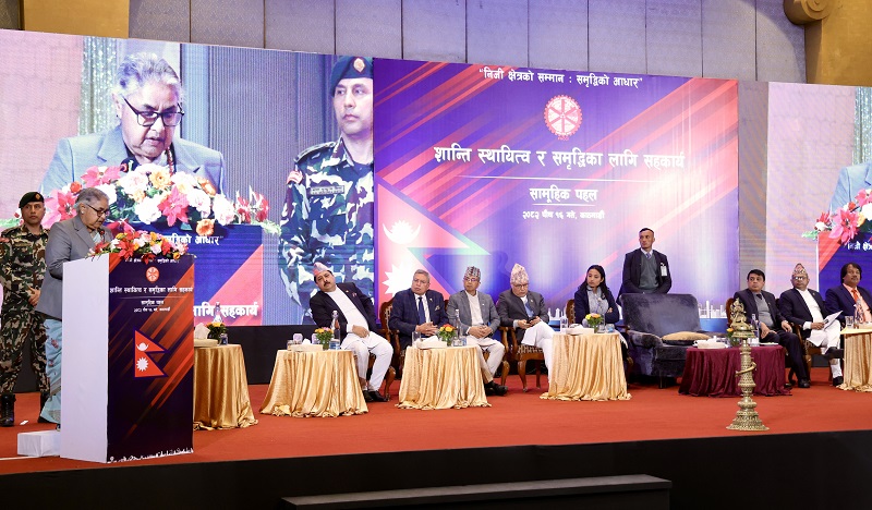नेपाल उद्योग वाणिज्य महासङ्घद्वारा आयोजित ‘शान्ति, स्थायित्व र समृद्धिका लागि सहकार्य–सामूहिक पहल’ कार्यक्रममा उहाँले राजनीतिक स्थिरता तथा विश्वास कायमगरी तोकिएको समयमा निर्वाचन सम्पन्न गर्नु सरकारको प्रमुख प्राथमिकता भएको उल्लेख गर्नुभयो ।