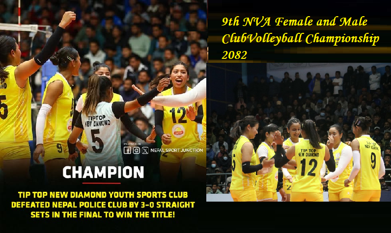 काठमाडौं, १९ पौष। न्यु डायमण्ड एकेडेमीले नवौं एनभीए महिला तथा पुरुष क्लब भलिबल च्याम्पियनसिप अन्तर्गत महिलातर्फको उपाधि जितेको छ।