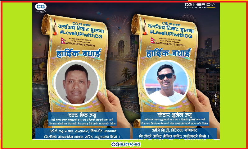 काठमाडौँ, २८ पुसः नेपालको सर्वाधिक विश्वासिलो इलेक्ट्रोनिक्स ब्रान्ड सिजी ब्रान्डले आफ्नो ‘सिजीको साथमा, वर्ल्डकप टिकट हातमा #LevelUP!withCG उपहार योजना अन्तर्गत ‘पहिलो चरणका विजेताहरू सार्वजनिक गरेको छ।