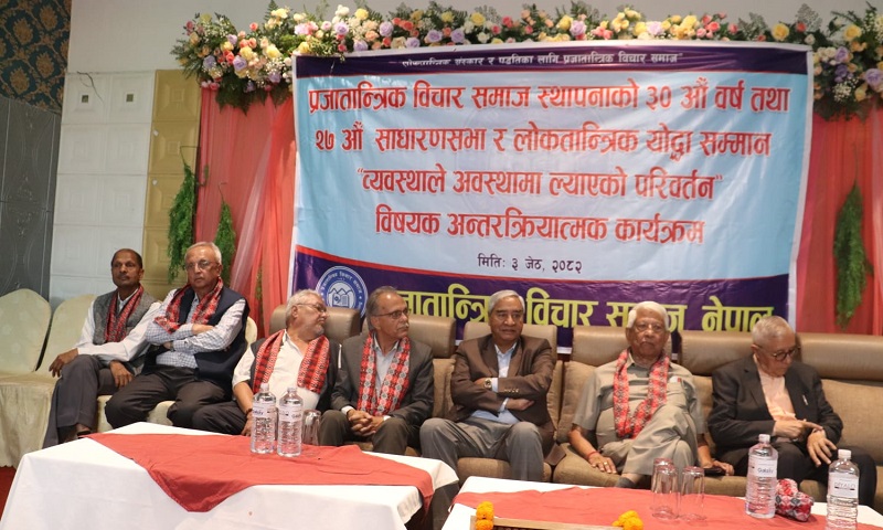 पूर्वमन्त्री डा सुरेश मल्लले प्रजातान्त्रिक विचार समाजले सत्यका पक्षमा वकालत गर्नुुुपर्नेमा जोड दिनुभयो । समाजका पूर्वअध्यक्ष हरिहर दाहालले २०५३ सालमा शेरबहादुर देउवा प्रधानमन्त्री हुँदा पजेरो संस्कृति भित्र्याएर राजनीतिलाई विकृत बनाउन खोजिएको भन्दै समाजले निर्णय गरेर विरोध भएकाले गलत काम गर्ने छुट कुनै सरकारलाई नभएको स्पष्ट पार्नुभयो ।