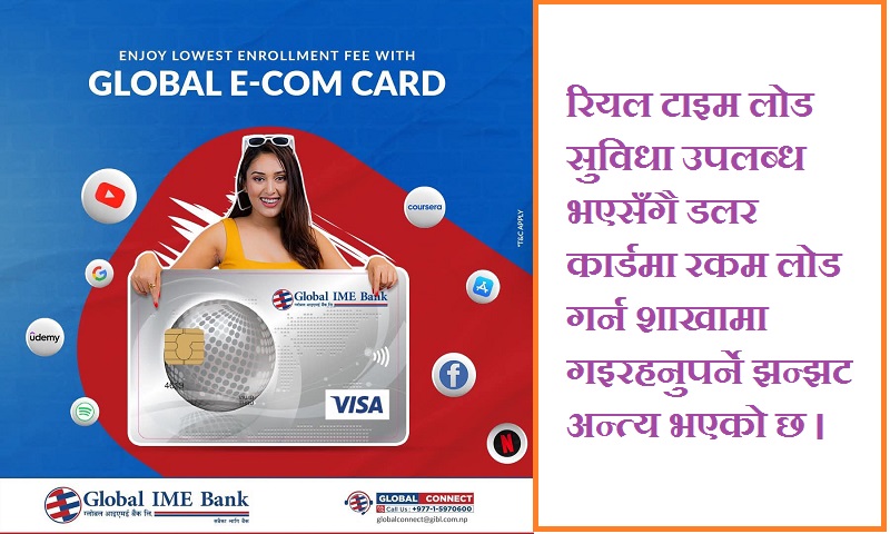 काठमाडौँ, १५ जेठ। डिजिटल बैंकिङलाई उच्च प्राथमिकता दिएको ग्लोबल आइएमई बैंकले ‘ग्लोबल स्मार्ट प्लस’ एपमा आकर्षक फिचर थप गरेको छ । बैंकले सेवाग्राहीलाई थप सहज र प्रभावकारी डिजिटल बैंकिङ सेवा प्रदान गर्ने उद्देश्यले मोबाइल एपमार्फत ई-कम डलर कार्डमा रियल टाइम लोड सुविधा उपलब्ध गराएको हो ।
