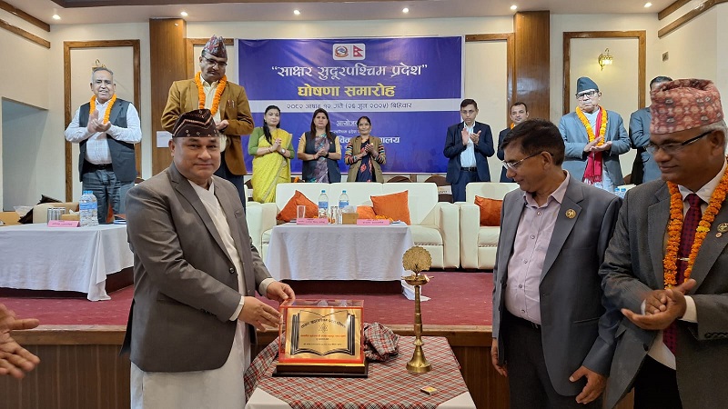 धनगढी(कैलाली), १२ असारः साक्षरताको सुनिश्चिततासँगै सुदूरपश्चिम प्रदेशलाई आज ‘साक्षर सुदूरपश्चिम प्रदेश’ घोषणा गरिएको छ । मुख्यमन्त्री कमलबहादुर शाहले आज धनगढीमा आयोजित समारोहमा साक्षर सुदूरपश्चिम प्रदेश घोषणा गर्नुभएको हो । सो अवसरमा उहाँले सूचना र प्रविधिले फड्को मारेको वर्तमान परिपे्रक्ष्यमा समयानुकूल शिक्षाको खाँचो रहेको बताउनुभयो ।