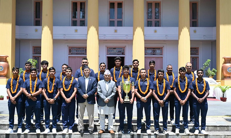 एसीसी यु–१६ इस्ट जोन कप क्रिकेट प्रतियोगिताको विजेता नेपाली टोलीलाई आज शीतल निवासमा बधाई दिँदै उहाँले क्रिकेटमा नेपालीले हात पारेको सफलता खेलाडीको खेलप्रतिको समर्पण, लगाव र मेहिनतको प्रतिफल भएको उल्लेख गर्नुभयो ।