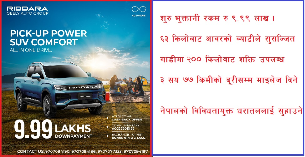 काठमाडौं, ११ साउन । सीजी मोटर्सले गिली अटो ग्रुपसंगको साझेदारीमा रिडारा आरडी सिक्स टूह्विल ड्राइभ विद्युतीय पिकअप गाडी सार्वजनिक गरेको छ ।