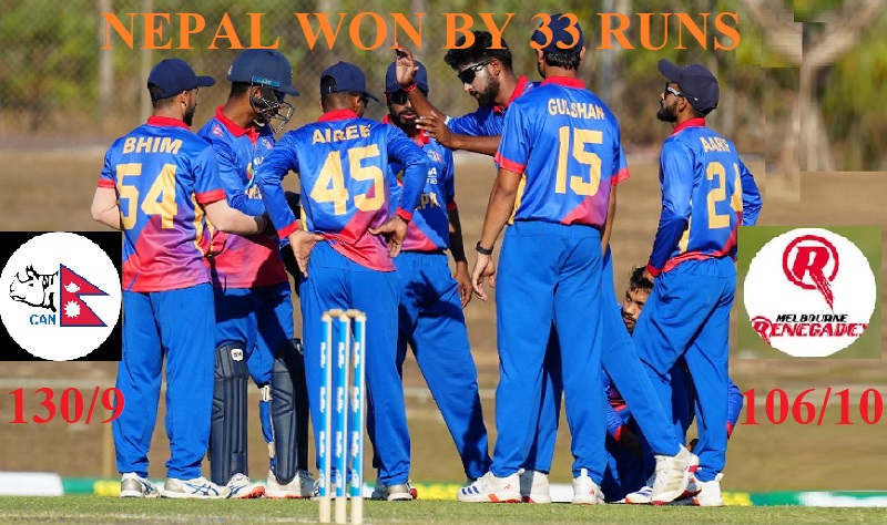 बलिङतर्फ रेनेगेड्सका फर्गस ओनिल, लचलान बाङ्स, क्यालम स्टो र माइकल आर्चरले समान दुई÷दुई विकेट लिए । नेपालले यसअघि खेलको चार खेलमध्ये एकमा जित तथा तीन खेलमा हार बेहोरेको थियो ।