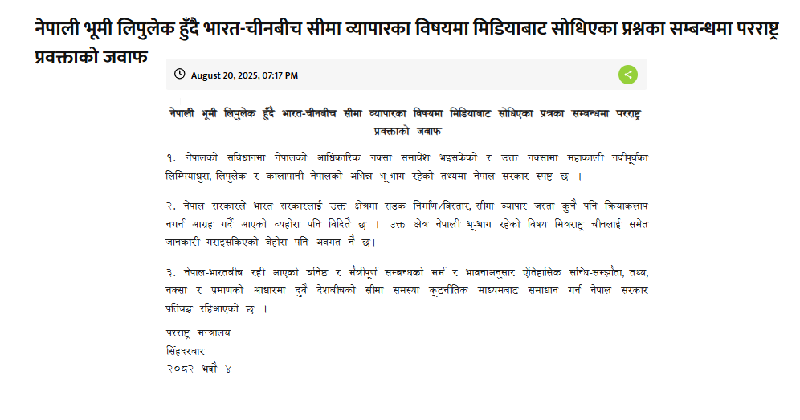 “नेपालको संविधानमा नेपालको आधिकारिक नक्सा समावेश भइसकेको र उक्त नक्सामा महाकाली नदीपूर्वका लिम्पियाधुरा, लिपुलेक र कालापानी नेपालको अभिन्न भूभाग रहेको तथ्यमा नेपाल सरकार स्पष्ट छ”, नेपालको परराष्ट्र मन्त्रालयले भनेको छ।