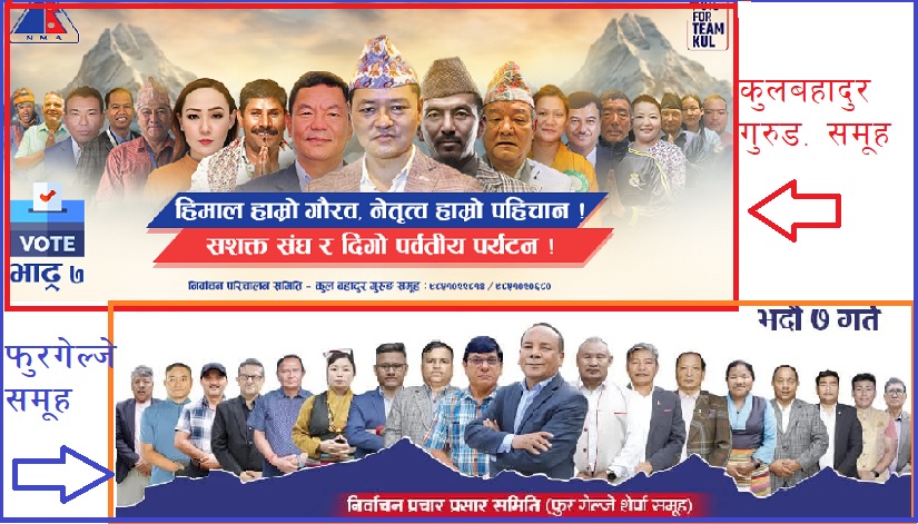 ‘हिमाल हाम्रो गौरव नेतृत्व हाम्रो पहिचान ,सशक्त संघ दिगो पर्वतीय पर्यटन ’, नारा लिएर चुनावी मैदानमा उत्रिएका गुरुङ समूहका अध्यक्ष कुलबहादुर गुरुड.ले भन्नुभयो ‘मसंग हिमालका बारेमा कानुनी तथा नीतिगत व्यवस्थापन, संस्था व्यवस्थापन, पेशागत हकहित, पर्यटन प्रवद्र्धनमा सक्रीयता लगायत राष्ट्रिय र अन्तर्राष्ट्रिय धेरै कुरामा अनुभव, सिकाई र अध्ययन छ । म पर्वतारोही, व्यवसायी र समग्र पर्वतारोहण श्रमिकको आवाज मात्र होईन, तपाईहरुको सपना र आशाको वाहक बन्न तयार छु । म एनएमएको नेतृत्व गर्न हरेक पक्षबाट तयार छु ।  नेपालको पर्वतीय पर्यटनलाई विश्वमा नयाँ पहिचान दिन, हिमालको सम्मान र पर्वतारोहीको हितको लागि ऐतिहासिक परिवर्तन ल्याउने अवसर मलाई र मेरो टिमलाई दिनुहोस । तपाईंलाई कहिल्यै निराश बनाउने छैन ।’
