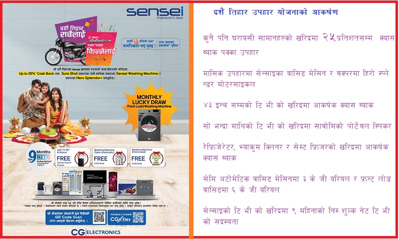 सेन्साइले हरेक चाडपर्वमा ग्राहकहरूको जीवनशैलीलाई अझ सहज, रमाइलो र आधुनिक बनाउन विशेष योजना ल्याउने परम्परा निरन्तरता दिएको छ। यसपालि पनि दशैं–तिहारमा ग्राहकले खरीदसँगै अतिरिक्त खुशी पाउनेछन्।