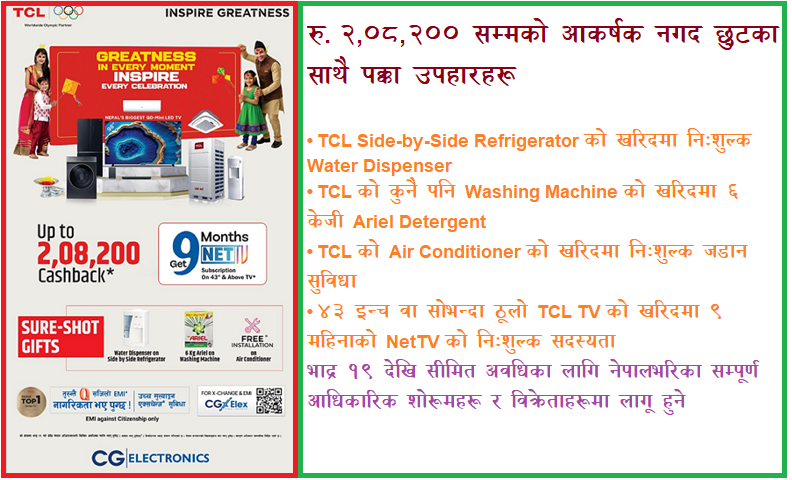 नेपालको सबैभन्दा ठूलो पर्वको अवसरमा TCL र CG Electronics सँगै नेपाली ग्राहकहरुलाई उत्कृष्ट प्रविधि र अभूतपूर्व अनुभव दिने लक्ष्य लिएको छ।