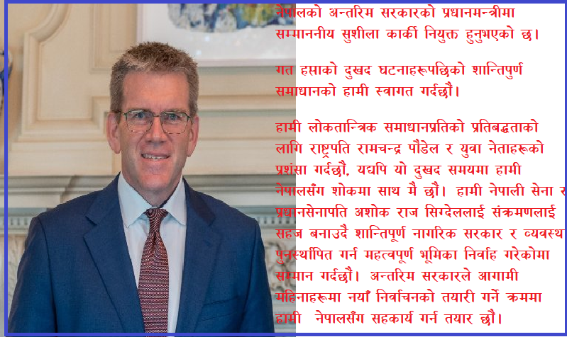 यहाँस्थित अमेरिकी दूतावासले आज विज्ञप्तिमार्फत गत हप्ताको दुःखद् घटनाहरूपछिको शान्तिपूर्ण समाधान भन्दै स्वागत गरेको हो । लोकतान्त्रिक समाधानप्रतिको प्रतिबद्धताका लागि राष्ट्रपति रामचन्द्र पौडेल र युवा नेताहरूको प्रशंसा गर्दै दूतावासले दुःखद् समयमा नेपालसँग शोकमा साथमै रहेको उल्लेख गरेको छ ।