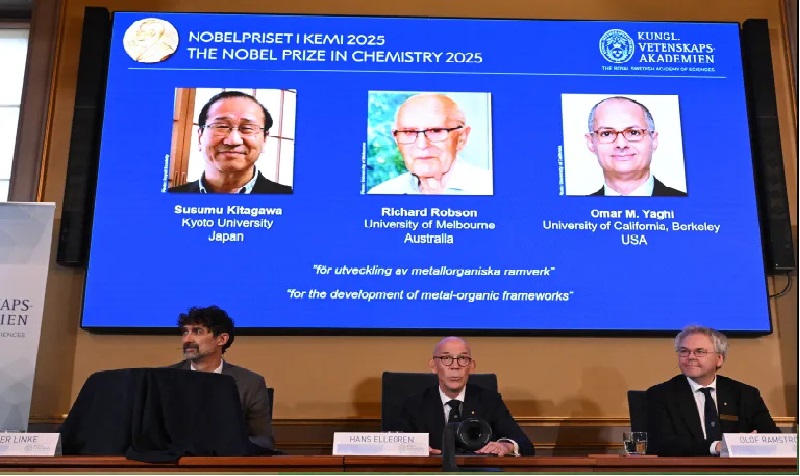 पुरस्कार समितिका अनुसार ’मेटल–अग्र्यानिक फ्रेमवर्क’ (एमओएफ) को विकास गरेका जापानका सुसुमु कितागावा, अस्ट्रेलियाका रिचर्ड रब्सन र अमेरिकाका ओमर यागीलाई सन् २०२५ को नोबेल पुरस्कार दिन लागिएको हो।