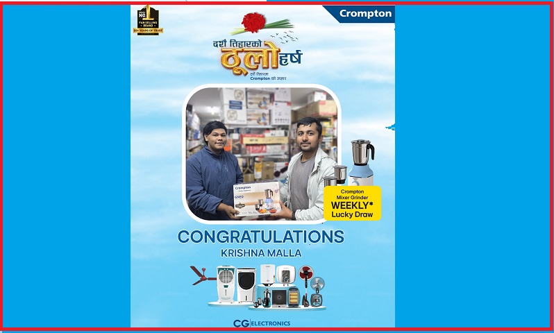 यस लकी ड्र अन्तर्गत Crompton Mixer Grinder जित्नुभएका श्रीकृष्ण मल्ललाई CG Electronics र Crompton को तर्फबाट हार्दिक बधाई छ।