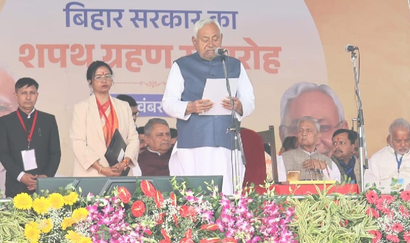 पटना, ४ मङ्सिर (रासस/एएनआई) : जनता दल (युनाइटेड) का प्रमुख नितिश कुमारले बिहीबार प्रधानमन्त्री नरेन्द्र मोदी तथा राष्ट्रिय लोकतान्त्रिक गठबन्धन (एनडिए) का वरिष्ठ नेताहरूको उपस्थितिमा इतिहास रच्दै दशौँ पटक बिहारको मुख्यमन्त्रीका रूपमा शपथ लिनुभएको छ ।