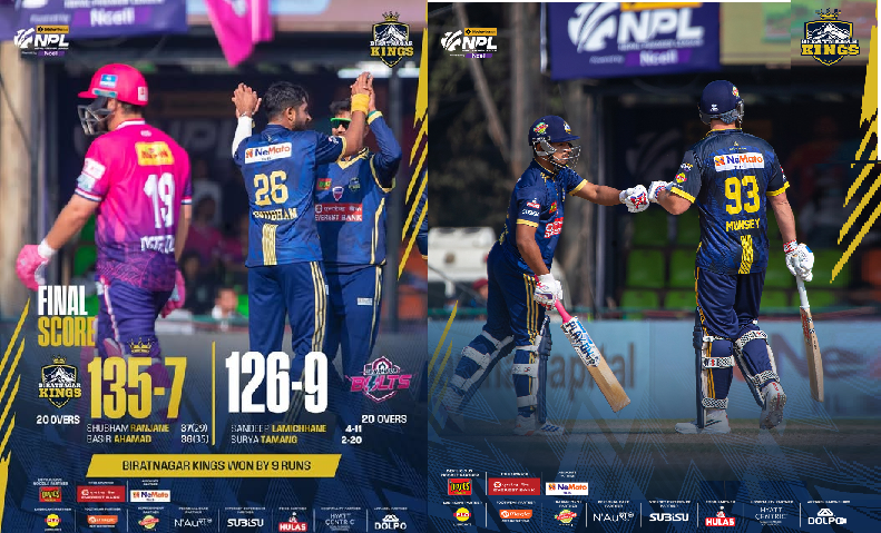 काठमाडौँ, ८ मङ्सिरः राजधानीमा जारी दोस्रो संस्करणको नेपाल प्रिमियर लिग (एनपिएल) मा कप्तान सन्दीप लामिछानेको उत्कृष्ट बलिङको मद्दतमा विराटनगर किङ्ग्स विजयी भएको छ । विराटनगर लगातार आफ्नो तेस्रो खेलमा विजयी भएको हो । आजको खेलमा विराटनगरले जनकपुर बोल्ट्सलाई नौ रनले हराएको हो ।