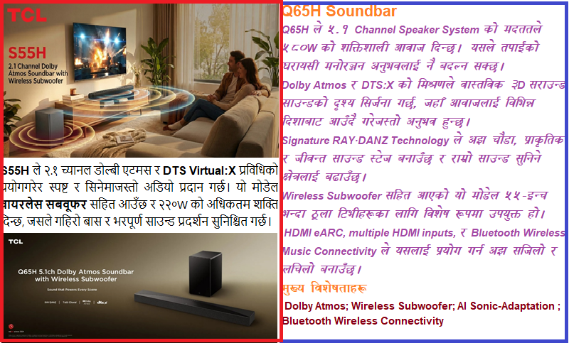 काठमाडौं, १२ मंसिर । विश्वप्रसिद्ध इलेक्ट्रोनिक्स ब्रान्ड TCL ले नेपाली बजारका लागि दुई अत्याधुनिक प्रिमियम साउन्डबार मोडेल S55H र Q65H सार्वजनिक गरेको छ। हालको क्रिकेट उत्साहलाई ध्यानमा राख्दै, घरमै बसेर स्टेडियमजस्तै अनुभव दिलाउने उद्देश्यसहित यी मोडेलहरू उपलब्ध गराइएको कम्पनीले जानकारी दिएको छ।