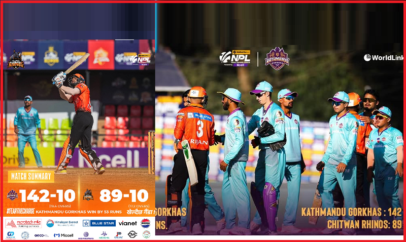 काठमाडौँ, १२ मङ्सिरः राजधानीमा जारी दोस्रो संस्करणको नेपाल प्रिमियर लिग (एनपीएल) क्रिकेटमा आजको पहिलो खेलमा काठमाडौँ गोर्खाजले चितवन राइनोजलाई ५३ रनले पराजित गरेको छ।