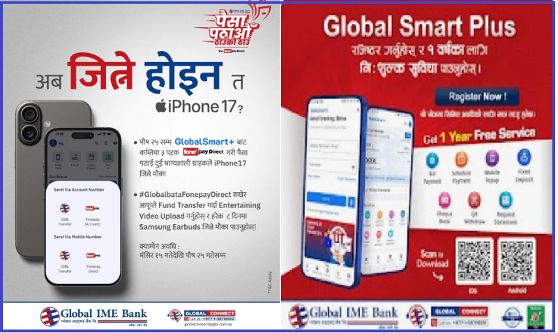 काठमाडौँ, १७ मङ्सिरः ग्लोबल आइएमई बैंक लिमिटेडले बैंकको मोबाइल बैंकिङ्ग–ग्लोबल स्मार्ट प्लसबाट कम्तिमा ३ पटक फोनपे नेटवर्कमार्फत रकमान्तर गर्दा आइफोन १७ जित्ने योजना सार्वजनिक गरेको छ ।