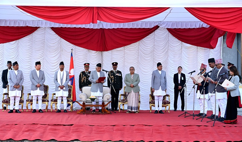 राष्ट्रपति रामचन्द्र पौडेलले राष्ट्रपति कार्यालयमा आज आयोजित विशेष समारोहमा नवनियुक्त भूमि व्यवस्था, सहकारी तथा गरिबी निवारणमन्त्री कुमारसिंह इङ्नाम, श्रम, रोजगार तथा तथा सामाजिक सुरक्षामन्त्री राजेन्द्रसिंह भण्डारी, वन तथा वातावरणमन्त्री माधव चौलागाईं र महिला, बालबालिका तथा ज्येष्ठ नागरिकमन्त्री श्रद्धा श्रेष्ठलाई सपथ गराउनुभएको हो ।
