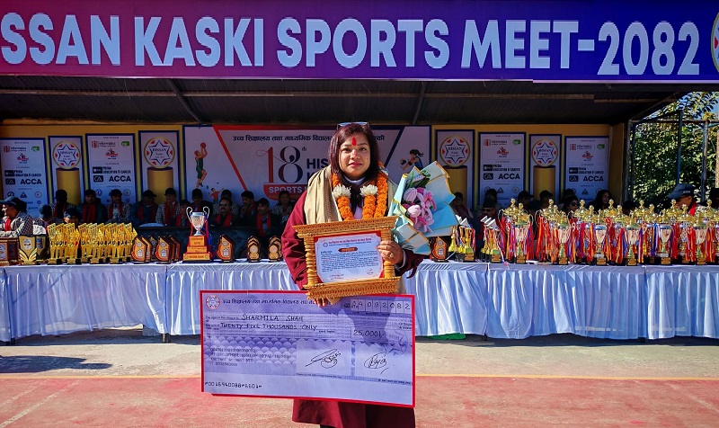 कास्की, ४ पुस : श्रीलङ्काको राजधानी कोलोम्बोमा हालै सम्पन्न वल्र्ड पावर लिफ्टिङ च्याम्पियनसिपमा महिलातर्फ च्याम्पियन बन्न सफल खेलाडी शर्मिला शाह आज पोखरामा सम्मानित हुनुभएको छ ।