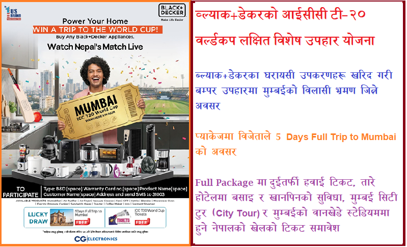काठमाडौं, १० पौष । विश्वप्रख्यात अमेरिकी ब्रान्ड ब्ल्याक+डेकर (Black+Decker) ले आफ्ना ग्राहकहरूका लागि “Power Your Home” भन्ने नाराका साथ आईसीसी टी–२० वर्ल्डकप लक्षित विशेष उपहार योजना सार्वजनिक गरेको छ।