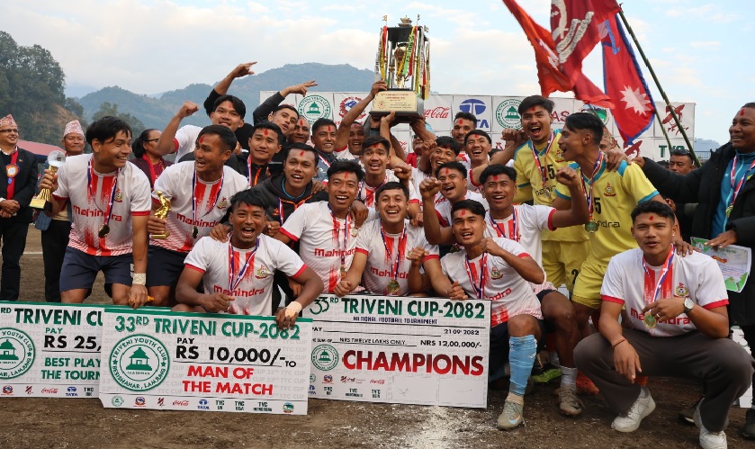 त्रिवेणी युवा क्लब बेँसीसहरको आयोजनामा आज सम्पन्न फाइनल खेलमा ल्याङ्दी देवी फुटबल क्लब नाल्मा लमजुङलाई ०– २ गोल अन्तरले पराजित गर्दै विभागीय टोली एपिएफले उपाधि जितेको हो । गतवर्ष पनि एपिएफले नै उपाधि जितेको थियो । उपाधिसँगै रु १२ लाख नगद पुरस्कार, मेडल, ट्रफी प्राप्त गरेको आयोजक क्लबका अध्यक्ष टेकजङ्ग गुरुङले बताउनुभयो । उपाधिबाट चुकेको नाल्माले रु छ लाख नगद पुरस्कारमा चित्त बुझाएको छ ।