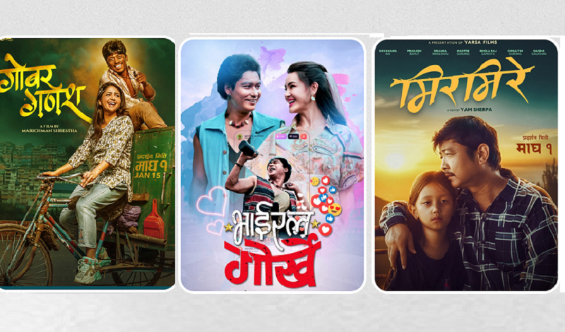 काठमाडौँ, १ माघः माघेसङ्क्रान्तिको अवसर पारेर आजदेखि तीन नयाँ नेपाली चलचित्र ‘गोबर गणेश’, ‘भाइरल गोर्खे’ र ‘मिरमिरे’ नेपालभरका चलचित्र भवनमा प्रदर्शन भएको छ । माघेसङ्क्रान्तिलाई लक्षित गर्दै दिइने बिदालाई लक्षित गर्दै चलचित्रका निर्माता तथा निर्देशकले चलचित्रले दर्शकको साथ पाउने अपेक्षासहित चलचित्र प्रदर्शनमा ल्याएका हुन् । यी तीनै चलचित्र सामाजिक कथावस्तुमा आधारित छन् ।
