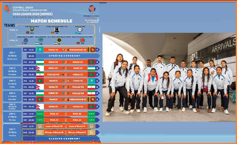 माले(माल्दिभ्स्), २१ माघ । नेपाल पुलिस क्लबले उज्वेकिस्तानको हुमो भिसीसँग खेल्दै काभा लिग महिलाको उपाधि रक्षाको यात्रा सुरु गर्नेछ।