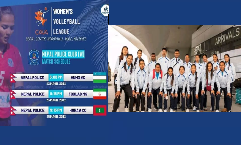 माले(माल्दिभ्स्), २२ माघ । काभा महिला क्लब लिग २०२६ अन्तरगत आज साबिक विजेता नेपाल पुलिस क्लब पहिलो खेल खेल्दै छ । नेपाली चेलीहरुले पहिलो खेलमा उज्बेकिस्तानको हुमो भलिबल क्लबसंग भिड्ने छन् ।