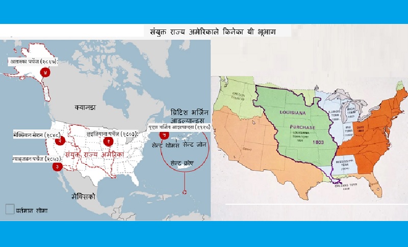 सन् १८०३ मा फ्रान्ससँग लुईजिआना खरिदले अमेरिकाको क्षेत्र विस्तार देखाउने नक्सा