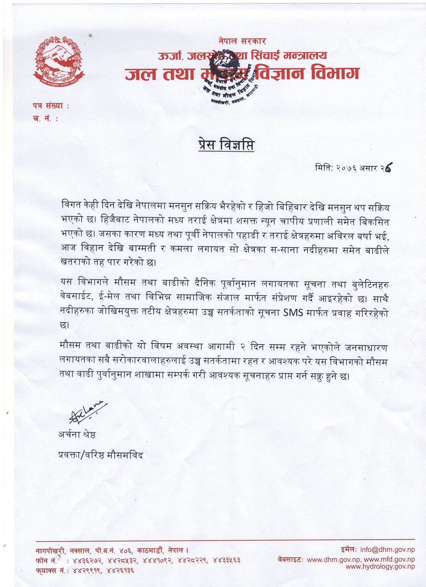 सवै शक्ति प्रतिकार्यमा लगाऔं pic.twitter.com/gXxPXTEWm8— Nepal Flood Alert! नेपाल बाढी सूचना! (@DHM_FloodEWS) July 12, 2019